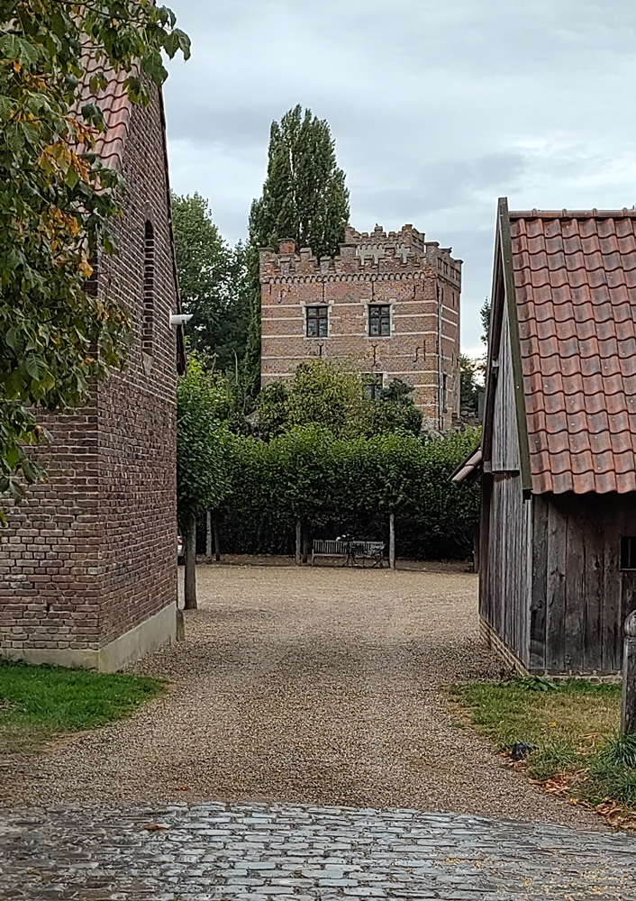 Beschreibung Schloss Weyer, Residenz der Herren von Wijer-Kozen, mit der Kirche im Nordwesten, außerhalb des Burggrabens, und dem Gehöft, dem ehemaligen Hof der örtlichen Herren, im Südosten. Der spätgotische Bergfried wurde in der ersten Hälfte des 16. Jahrhunderts (?) von Teynard de Kerckhem (gest. 1554) erbaut; 1657 von Arnold de Kerckhem, Bürgermeister von Lüttich, renoviert, der 1661 seine Cousine Anne-Marie van Kerckhem heiratete (beide Wappen sind auf dem Giebelstein über dem Tor abgebildet). Aus dieser Zeit stammen das Gehöft des Schlosses, das Eingangstor (ehemals mit Zugbrücke) und das Haus mit Walmdach. In der zweiten Hälfte des 17. Jahrhunderts wurde es aufgrund von Schulden an den Großkomtur von Alden Biesen verkauft, war jedoch ab 1699 im Besitz der Familie van Afferden, die es 1830 an die Familie de Diest verkaufte. Seit 1880 besaß J. Jacquelart das Schloss und führte zahlreiche neugotische Renovierungen durch; seinen heutigen Zustand erhielt es 1910; heute ist es im Besitz der Familie Willems. Von der Wasserburg ist nur noch der Bergfried mit seinem Treppenturm aus dem 16. Jahrhundert erhalten; an der Südseite, an den Bergfried angelehnt, befindet sich ein rechteckiger Bau mit einem Volumen aus dem 18. Jahrhundert (Dach), aber einem älteren Kern (Nordfassade), der im 19. Jahrhundert gründlich renoviert wurde; im Norden befindet sich eine neugotische Terrassenanlage. Der Wassergraben ist noch vorhanden; eine Backsteinbrücke mit drei Rundbögen überquert ihn und verbindet die Burg mit dem Schlosshof. Die Anlage liegt in einer intakten, waldreichen Umgebung. Ein rechteckiger Bergfried mit drei Jochen und drei Stockwerken unter einem Flachdach weist neugotische Zinnen mit einem absenkbaren Bogenfries auf. Das Backsteingebäude ist unterkellert und hat einen Sockel mit Mergelsteinbesatz. Schmiedeeiserne Maueranker in verschiedenen Formen aus unterschiedlichen Epochen; Mergelsteinbänder. Die Ostfassade (die Vorderseite) weist sechs ehemals teilweise verglaste Kreuzfenster aus Gobertange-Stein auf, von denen Sohlbank und Pfosten entfernt wurden; ein Rahmen aus Ecksteinen mit viertelrundem Gesims; die Sohlbänke sind spätere Ergänzungen; ein Entlastungsbogen mit Rollgesims; die oberen Fenster weisen ein leicht vorspringendes Tropfgesims auf. Die gepflasterte Auffahrt führt zu einem Rundbogentor, das oberhalb des Tropfgesimses mit 1657 datiert ist; das Tor befindet sich in einem vertieften Bereich des rechteckigen Kalksteinrahmens, der wiederum aus Ecksteinen und einem profilierten Tropfgesims besteht; links und rechts oberhalb des Tropfgesimses sind in Kalkstein gemeißelte Lilienmotive (?) zu sehen; dazwischen befindet sich eine Tafel mit dem Datum, flankiert von Rankenwerk, das eine kurze Tropfleiste trägt; darüber befinden sich zwei Wappen mit Lilien und die Inschrift: KERCKHEM/ KERCKHEM; auch dieser Stein ist mit einer Tropfleiste ausgekleidet. Die Nordfassade ist teilweise durch die Terrasse verdeckt; ein Kreuzgangfenster mit erhaltenem Mittelkreuz und ein Kreuzfenster, beide oben beschrieben. Die Westfassade ist blind; der quadratische Treppenturm wurde daran angebaut und erhebt sich eingeschossig über den Bergfried. Er weist kleine rechteckige Fenster in einem profilierten Rahmen aus Gobertange-Stein mit Ecksteinen auf; neugotische Zinnen. Zwei Kreuzgangfenster mit Gittern befinden sich im oberen Teil der Südfassade; daran angrenzend befinden sich zwei spätere oder stark veränderte Backsteingebäude mit Pultdächern (Schindeln, Kunstschiefer). Das angrenzende quadratische Gebäude an der Westfassade des Bergfrieds hat zwei bzw. drei Joche und zwei Stockwerke unter einem Walmdach (Schindeln). Dieses Backsteingebäude hat ein erhöhtes Erdgeschoss, das an der Südseite von zwei Strebepfeilern getragen wird; schmiedeeiserne Maueranker in verschiedenen Formen; die Fassaden wurden im 19. Jahrhundert grundlegend verändert und mit rechteckigen Maueröffnungen versehen. Auf der Westseite scheint ein kleines, rechteckiges Fenster in einem mit Ecksteinen abgeschlossenen Rahmen erhalten geblieben zu sein. Die neugotische Terrasse weist Spuren eines älteren Kerns auf, der jedoch nicht mehr nachweisbar ist. Im Bergfried befinden sich ein gotischer Kamin und vor der Decke des Erdgeschosses barocke Stuckarbeiten mit Wappen (der Familie van Afferden), datiert 1716. Lit.: Quelle: SCHLUSMANS F. in Zusammenarbeit mit GYSELINCK J., LINTERS A., WISSELS R., BUYLE M. & DE GRAEVE M.-C. 1981: Inventar des kulturellen Erbes in Belgien, Architektur, Provinz Limburg, Bezirk Hasselt, Bauen im Wandel der Zeit in Flandern 6n2 (He-Z), Brüssel-Gent. |