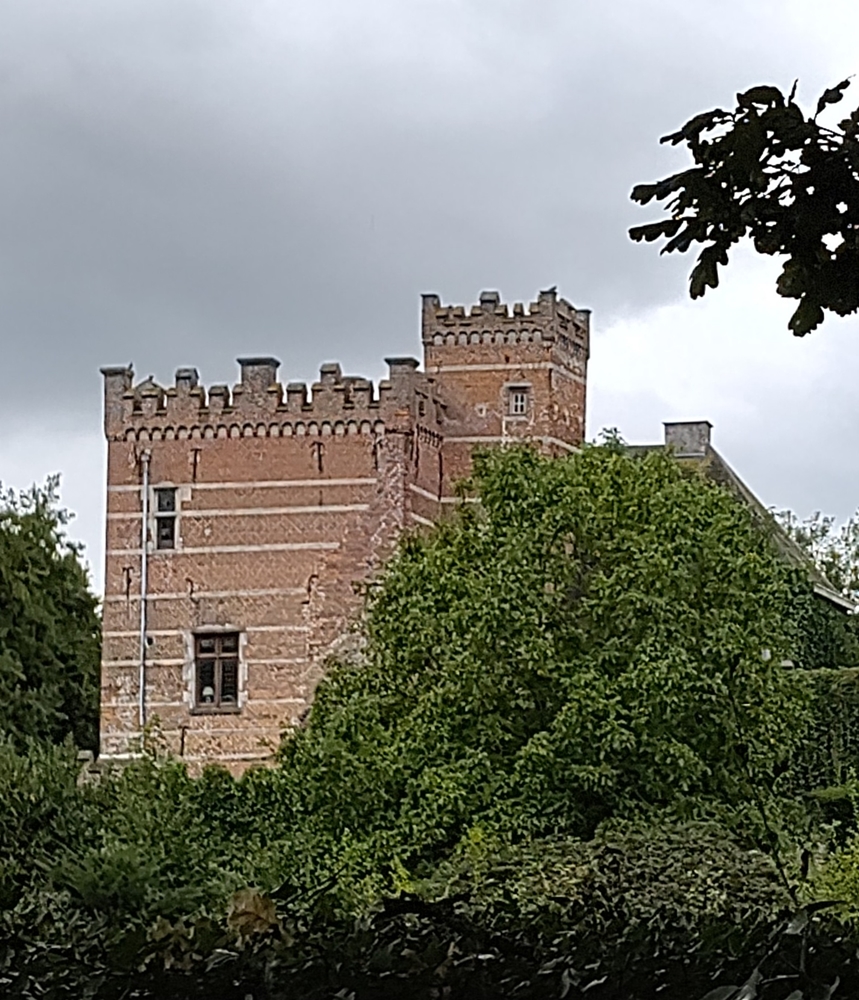 Beschreibung Schloss Weyer, Residenz der Herren von Wijer-Kozen, mit der Kirche im Nordwesten, außerhalb des Burggrabens, und dem Gehöft, dem ehemaligen Hof der örtlichen Herren, im Südosten. Der spätgotische Bergfried wurde in der ersten Hälfte des 16. Jahrhunderts (?) von Teynard de Kerckhem (gest. 1554) erbaut; 1657 von Arnold de Kerckhem, Bürgermeister von Lüttich, renoviert, der 1661 seine Cousine Anne-Marie van Kerckhem heiratete (beide Wappen sind auf dem Giebelstein über dem Tor abgebildet). Aus dieser Zeit stammen das Gehöft des Schlosses, das Eingangstor (ehemals mit Zugbrücke) und das Haus mit Walmdach. In der zweiten Hälfte des 17. Jahrhunderts wurde es aufgrund von Schulden an den Großkomtur von Alden Biesen verkauft, war jedoch ab 1699 im Besitz der Familie van Afferden, die es 1830 an die Familie de Diest verkaufte. Seit 1880 besaß J. Jacquelart das Schloss und führte zahlreiche neugotische Renovierungen durch; seinen heutigen Zustand erhielt es 1910; heute ist es im Besitz der Familie Willems. Von der Wasserburg ist nur noch der Bergfried mit seinem Treppenturm aus dem 16. Jahrhundert erhalten; an der Südseite, an den Bergfried angelehnt, befindet sich ein rechteckiger Bau mit einem Volumen aus dem 18. Jahrhundert (Dach), aber einem älteren Kern (Nordfassade), der im 19. Jahrhundert gründlich renoviert wurde; im Norden befindet sich eine neugotische Terrassenanlage. Der Wassergraben ist noch vorhanden; eine Backsteinbrücke mit drei Rundbögen überquert ihn und verbindet die Burg mit dem Schlosshof. Die Anlage liegt in einer intakten, waldreichen Umgebung. Ein rechteckiger Bergfried mit drei Jochen und drei Stockwerken unter einem Flachdach weist neugotische Zinnen mit einem absenkbaren Bogenfries auf. Das Backsteingebäude ist unterkellert und hat einen Sockel mit Mergelsteinbesatz. Schmiedeeiserne Maueranker in verschiedenen Formen aus unterschiedlichen Epochen; Mergelsteinbänder. Die Ostfassade (die Vorderseite) weist sechs ehemals teilweise verglaste Kreuzfenster aus Gobertange-Stein auf, von denen Sohlbank und Pfosten entfernt wurden; ein Rahmen aus Ecksteinen mit viertelrundem Gesims; die Sohlbänke sind spätere Ergänzungen; ein Entlastungsbogen mit Rollgesims; die oberen Fenster weisen ein leicht vorspringendes Tropfgesims auf. Die gepflasterte Auffahrt führt zu einem Rundbogentor, das oberhalb des Tropfgesimses mit 1657 datiert ist; das Tor befindet sich in einem vertieften Bereich des rechteckigen Kalksteinrahmens, der wiederum aus Ecksteinen und einem profilierten Tropfgesims besteht; links und rechts oberhalb des Tropfgesimses sind in Kalkstein gemeißelte Lilienmotive (?) zu sehen; dazwischen befindet sich eine Tafel mit dem Datum, flankiert von Rankenwerk, das eine kurze Tropfleiste trägt; darüber befinden sich zwei Wappen mit Lilien und die Inschrift: KERCKHEM/ KERCKHEM; auch dieser Stein ist mit einer Tropfleiste ausgekleidet. Die Nordfassade ist teilweise durch die Terrasse verdeckt; ein Kreuzgangfenster mit erhaltenem Mittelkreuz und ein Kreuzfenster, beide oben beschrieben. Die Westfassade ist blind; der quadratische Treppenturm wurde daran angebaut und erhebt sich eingeschossig über den Bergfried. Er weist kleine rechteckige Fenster in einem profilierten Rahmen aus Gobertange-Stein mit Ecksteinen auf; neugotische Zinnen. Zwei Kreuzgangfenster mit Gittern befinden sich im oberen Teil der Südfassade; daran angrenzend befinden sich zwei spätere oder stark veränderte Backsteingebäude mit Pultdächern (Schindeln, Kunstschiefer). Das angrenzende quadratische Gebäude an der Westfassade des Bergfrieds hat zwei bzw. drei Joche und zwei Stockwerke unter einem Walmdach (Schindeln). Dieses Backsteingebäude hat ein erhöhtes Erdgeschoss, das an der Südseite von zwei Strebepfeilern getragen wird; schmiedeeiserne Maueranker in verschiedenen Formen; die Fassaden wurden im 19. Jahrhundert grundlegend verändert und mit rechteckigen Maueröffnungen versehen. Auf der Westseite scheint ein kleines, rechteckiges Fenster in einem mit Ecksteinen abgeschlossenen Rahmen erhalten geblieben zu sein. Die neugotische Terrasse weist Spuren eines älteren Kerns auf, der jedoch nicht mehr nachweisbar ist. Im Bergfried befinden sich ein gotischer Kamin und vor der Decke des Erdgeschosses barocke Stuckarbeiten mit Wappen (der Familie van Afferden), datiert 1716. Lit.: Quelle: SCHLUSMANS F. in Zusammenarbeit mit GYSELINCK J., LINTERS A., WISSELS R., BUYLE M. & DE GRAEVE M.-C. 1981: Inventar des kulturellen Erbes in Belgien, Architektur, Provinz Limburg, Bezirk Hasselt, Bauen im Wandel der Zeit in Flandern 6n2 (He-Z), Brüssel-Gent. |